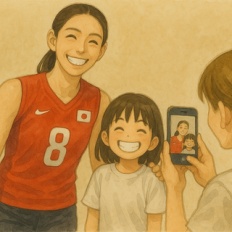 女子バレーボール選手と記念写真を撮る小学生女子